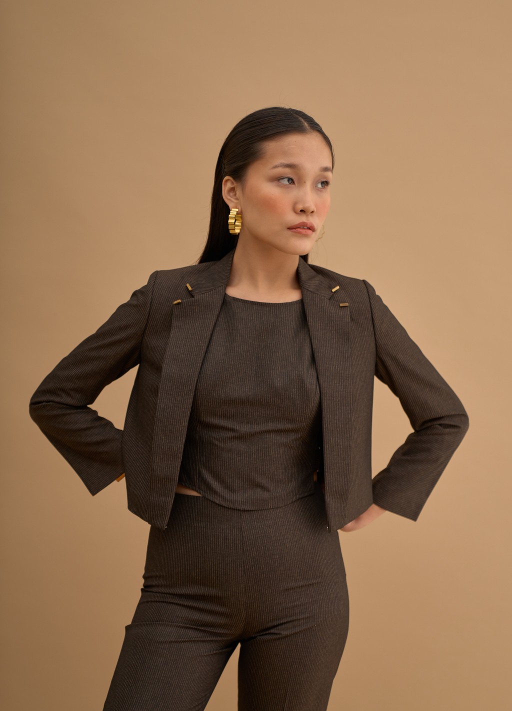 Boxy cropped blazer with slim notched Lapel collar, sleeves with slit in front. Concealed button closure.