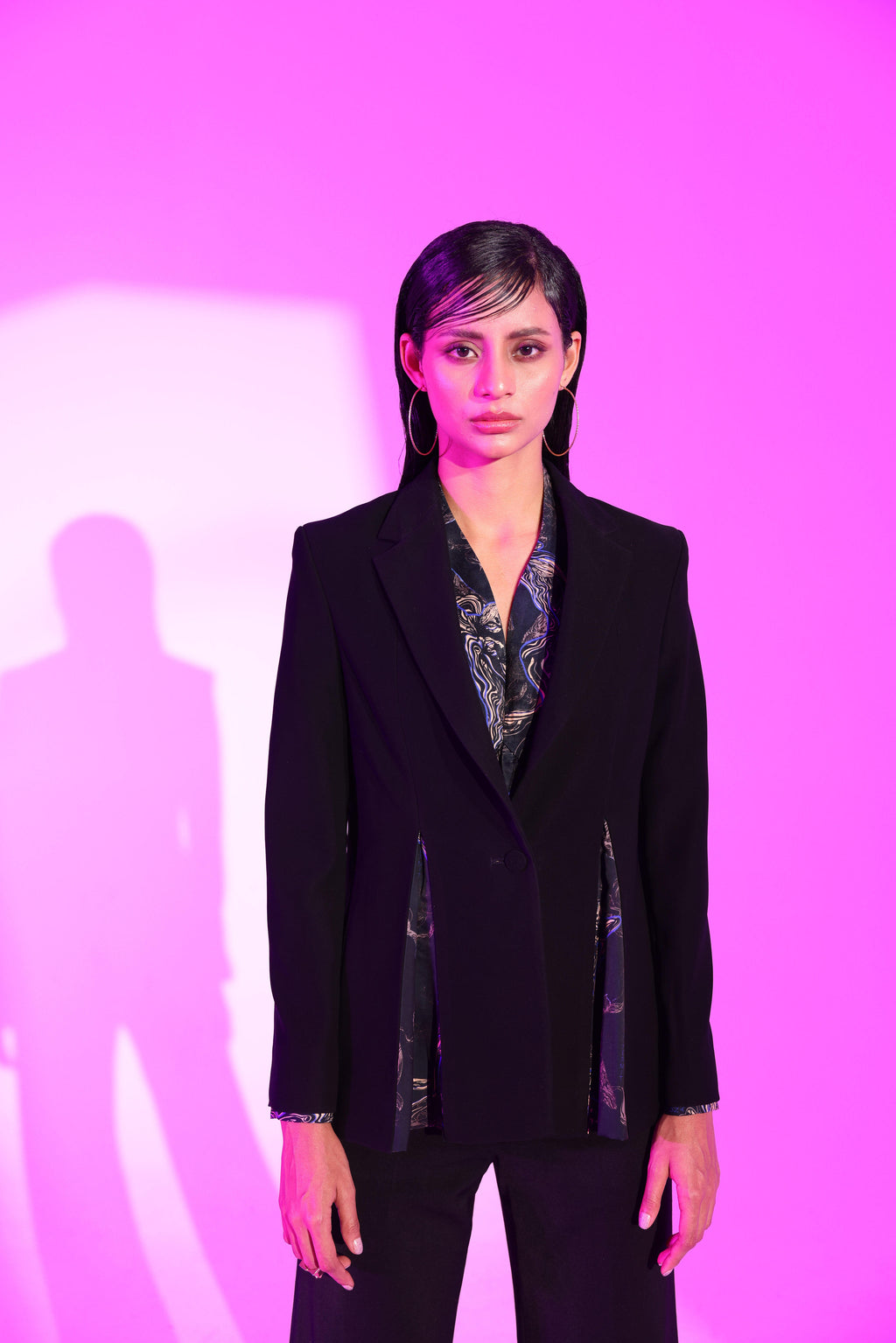 Boxy cropped blazer with swirl panel. Slim notched Lapel collar with front slit sleeves. Concealed button fastening.