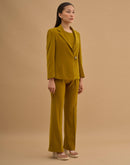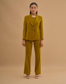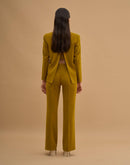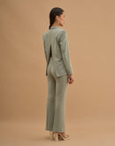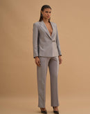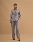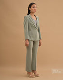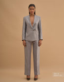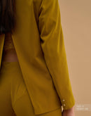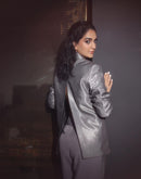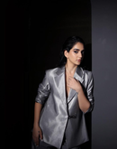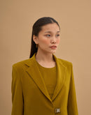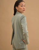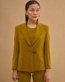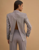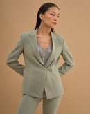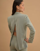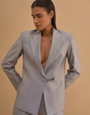 Single breasted blazer with notched lapel collar and metal closure in front. Long sleeves with show button cuffs. Finished with a big slit in back.