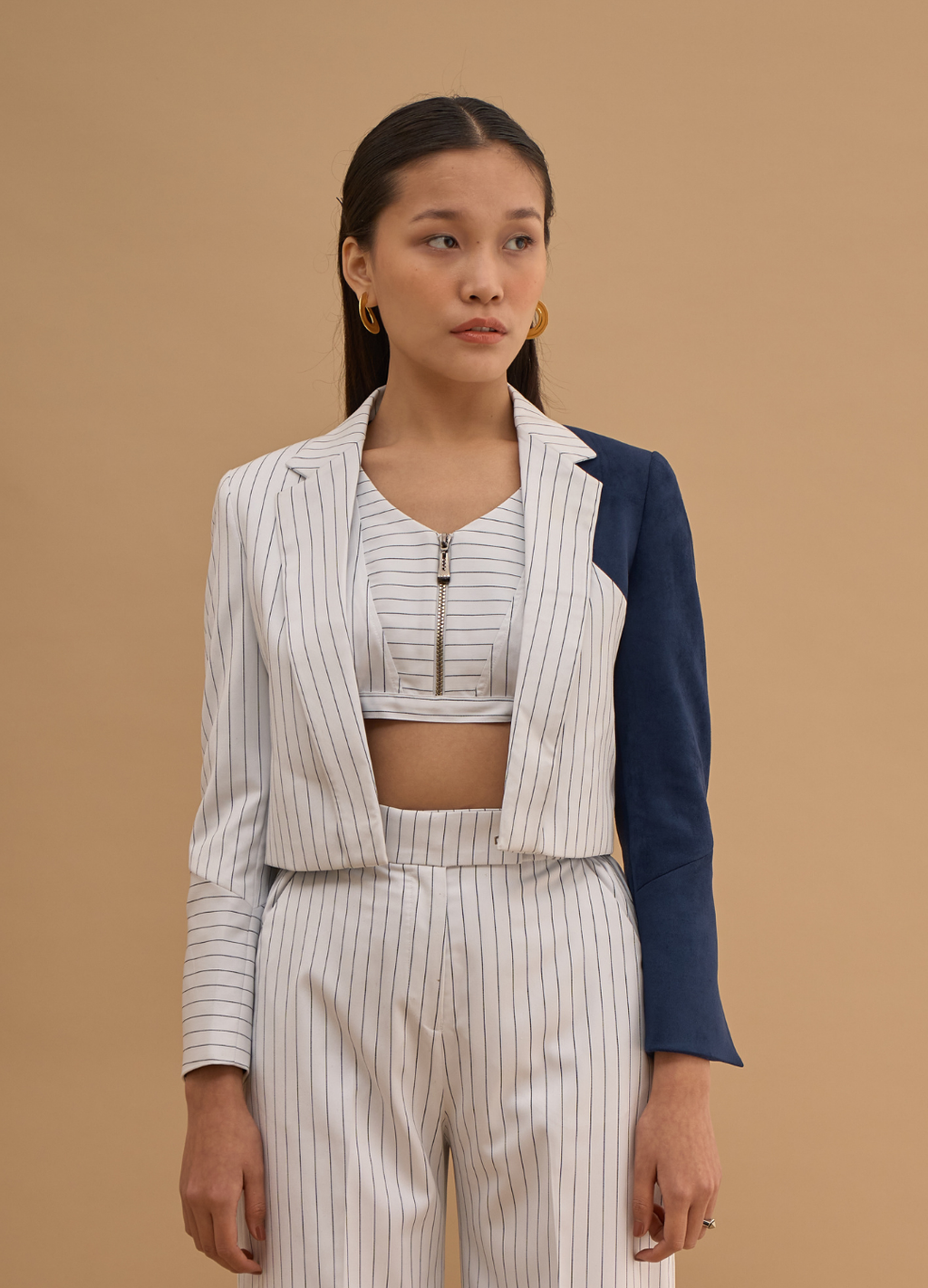Boxy cropped blazer with swirl panel. Slim notched Lapel collar with front slit sleeves. Concealed button fastening.