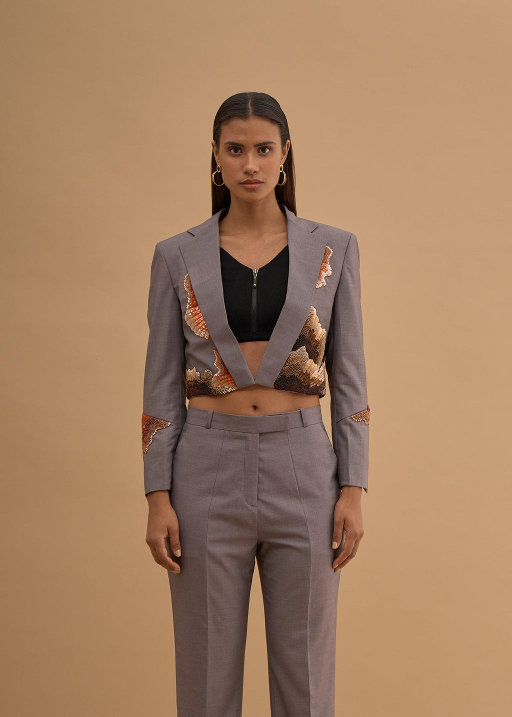 Hand embordered Boxy cropped blazer with slim notched Lapel collar, sleeves with slit in front. Concealed button closure.