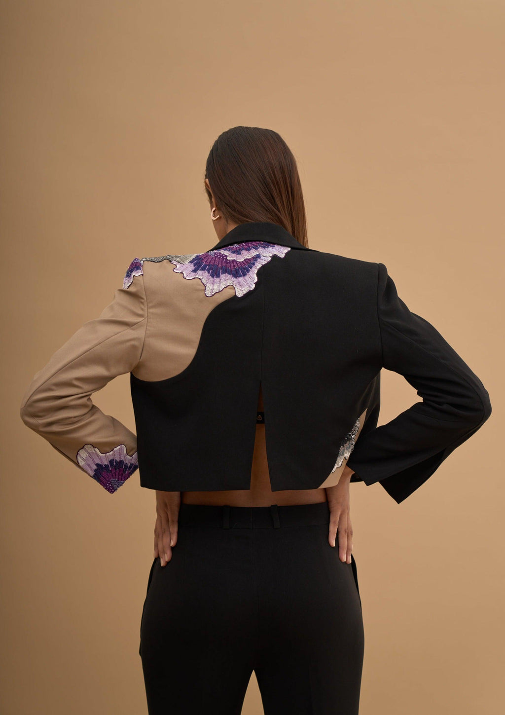 Hand embroidered Boxy cropped blazer with swirl panel. Slim notched Lapel collar with front slit sleeves. Concealed button fastening.
