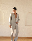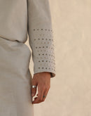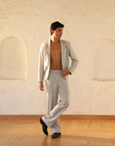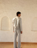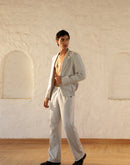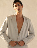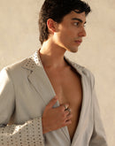 The Cosmic Grey Set comes with a striking light-grey blazer adorned with metallic rivets on the lapel and cuffs, giving the outfit an audacious edge. Paired with matching grey trousers, this ensemble delivers a sleek, avant-garde silhouette with a touch of rebellious glamour. Ideal for evening events where a statement look is desired.