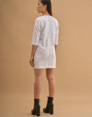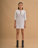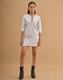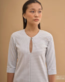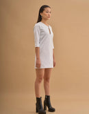 Boxy short dress with key hole neck, riveting in the back panel and metal button closure in front.