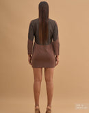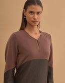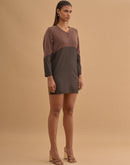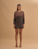 Paneled Boxy short dress with key hole neck and metal button closure in front.