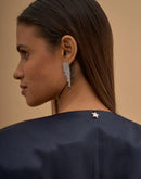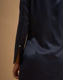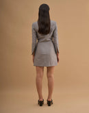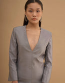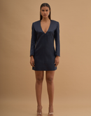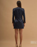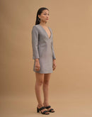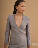 Fitted blazer dress with V-neck and long sleeves with front slit and decorated with metal button.
