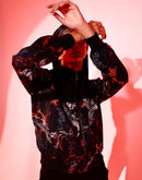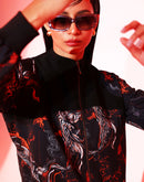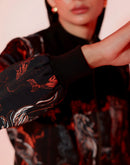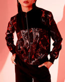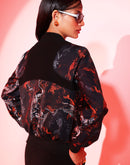 Make a statement with our bold printed bomber jacket. The design features a unique element of plain black fabric, forming a cage in the front that adds a touch of edginess to the overall look. The jacket is made with high-quality material, ensuring both comfort and durability. Whether you're dressing up or down, our printed bomber jacket is the perfect addition to any outfit. Experience the ultimate in style and sophistication with our jacket today.