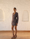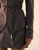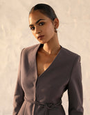 The Granite Co-ord features a stylish snatched-waist blazer with a V neckline and long sleeves, adorned with striking metal elements on the sleeves. Paired with a high-waisted pencil skirt, this set is crafted from a textured fabric in a rich gray tone, offering a modern and sophisticated look. Perfect for both casual and semi-formal occasions, it embodies the essence of a power professional, effortlessly elevating your ensemble.