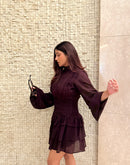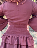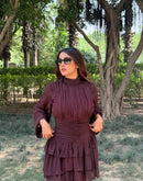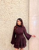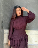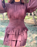 The dress features a high neckline and finely pleated bodice that adds textural interest. The cinched waistline, detailed with gathered ruching, flatters the silhouette and flows into a tiered ruffle skirt that brings movement and femininity to the piece. The full-length bishop sleeves add a soft, romantic flair, perfectly balancing the structured top.