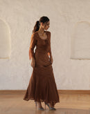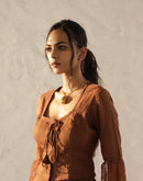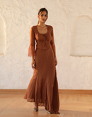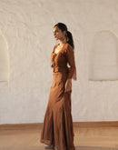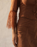 The Cinnamon Co-ord features a stylish crop top with a flattering scoop neckline with delicate lace detailing on the sleeve, the shirring detail on the back not only adds texture to the fabric but also enhances the whole look paired with a , asymmetrical cascading pannel skirt. The warm cinnamon hue and structured design create a sophisticated and inviting look, perfect for both daytime outings and evening events.