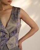 V-neck waistcoat with a front metal buckle closure in the front, complemented by a stylish cut out detail at the back. The perfect blend of style and function, this waistcoat adds a touch of sophistication to any ensemble. Whether dressed up or down, it's sure to be a versatile and eye-catching addition to your wardrobe.