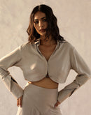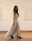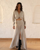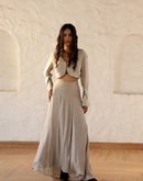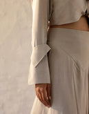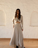 The Sandstone Set features a long-sleeved beige crop top with intricate sleeve detailing with a mettallic buckle closure in front, paired with a matching high-waisted flaired long skirt with a yoke and a slit. Its neutral tones and accents create a refined yet relaxed ensemble, perfect for an effortless and polished look.