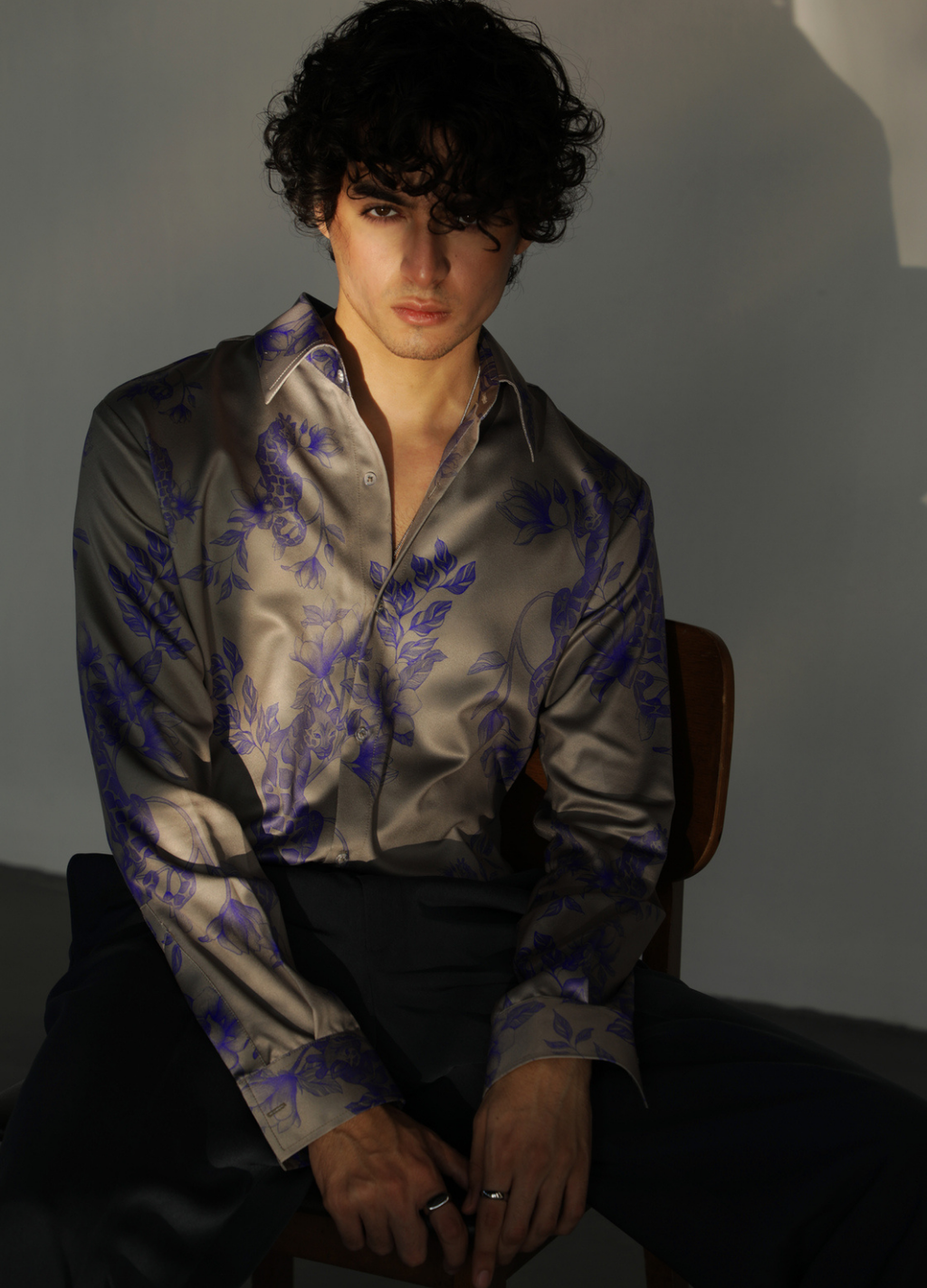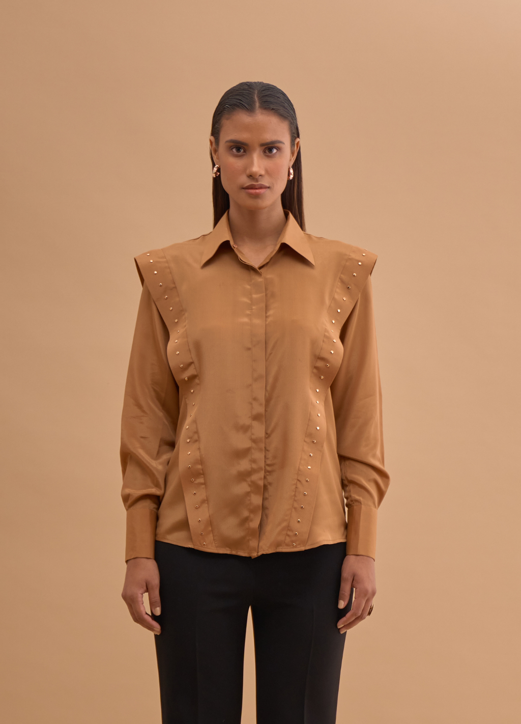 Paneled Shirt with classic collar, long sleeves with buttoned up cuff and concealed button closure with studded panels.