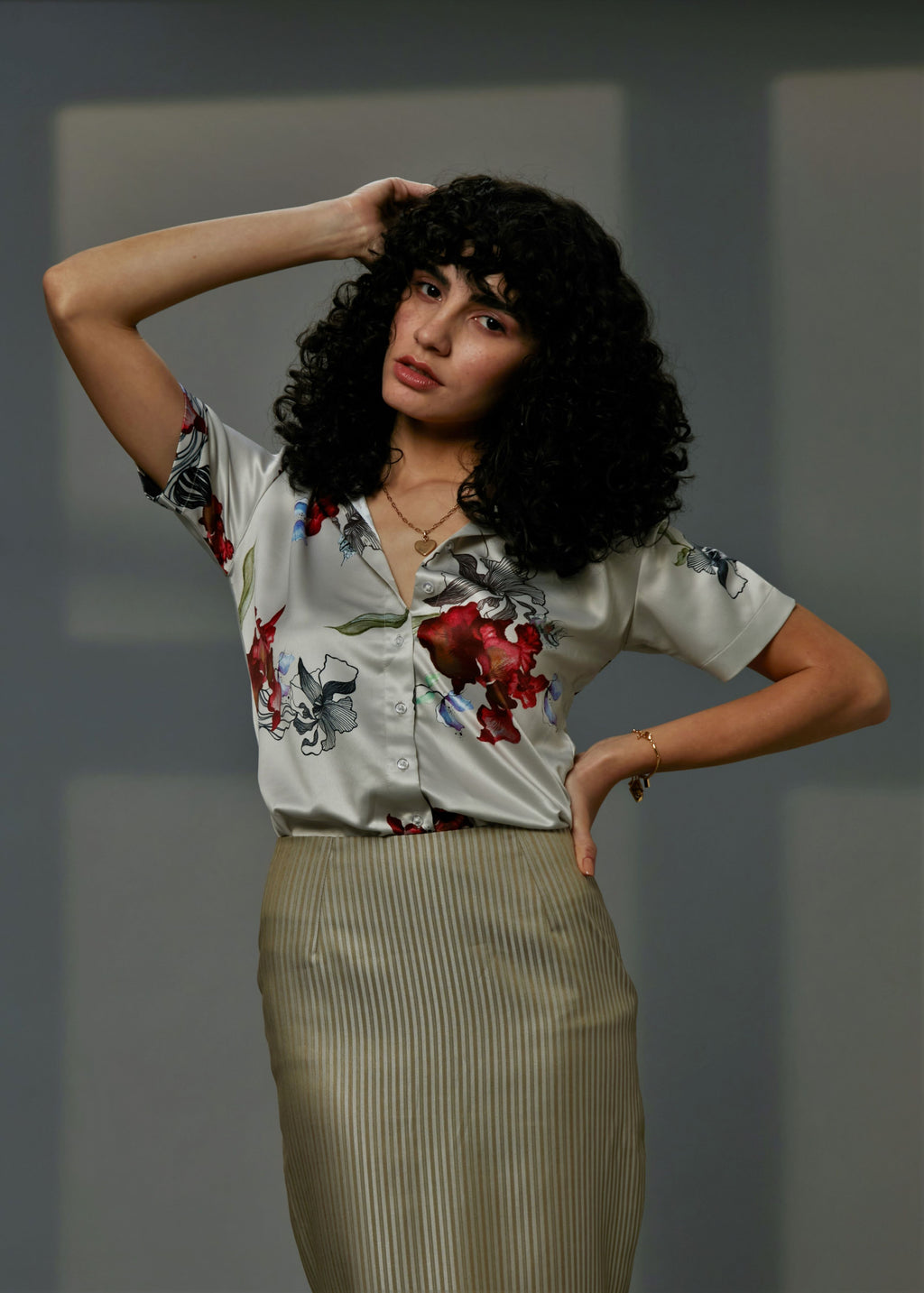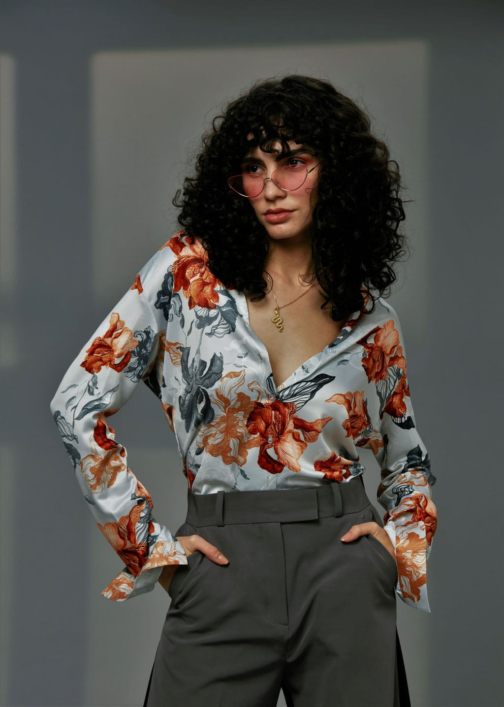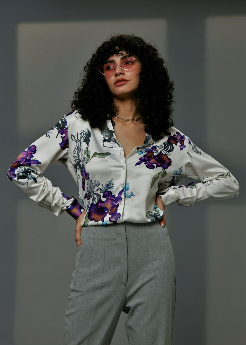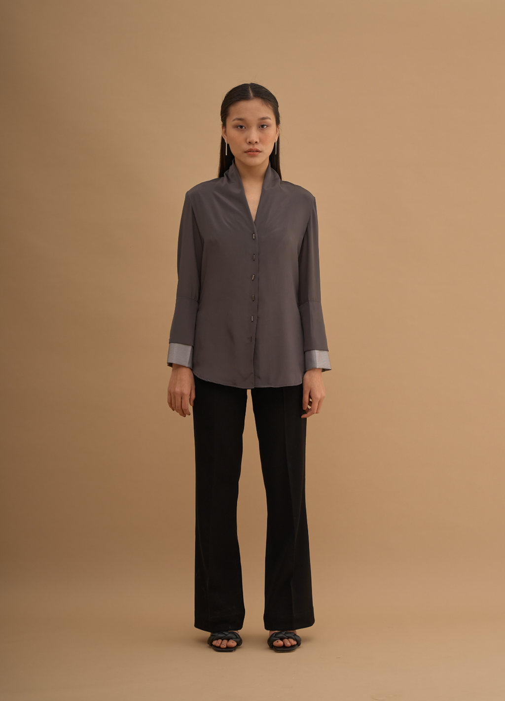 Cowl neck shirt with front buttons closure. The sleeves are finished with double layered cuff.
