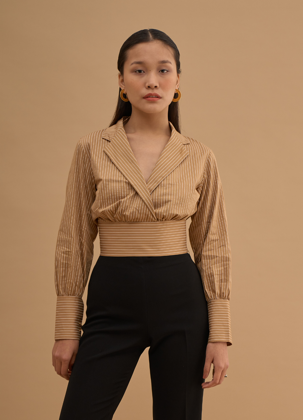 Waist sash shirt with notched lapel. Sleeves finished with wide cuff and metal eyelets and metal rope ends. Concealed zip closure on the side.