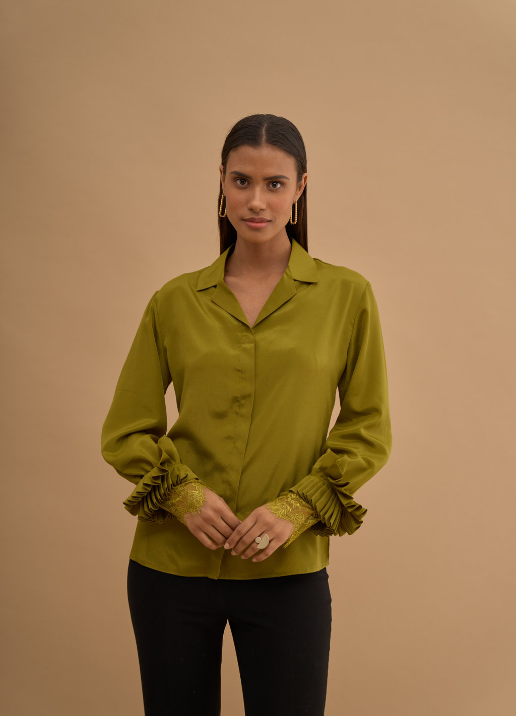 Pleated sleeve Shirt with notched collar, concealed buttons closure. Long sleeves with pleats and delicate lace.