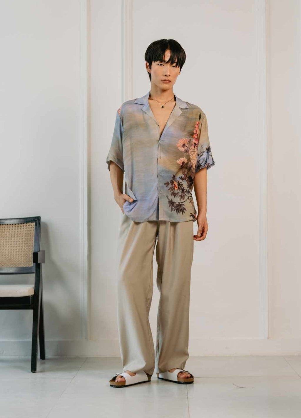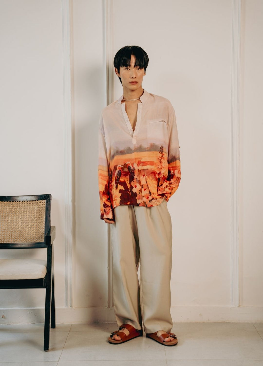 A breezy statement shirt in ultra-soft, featherlight fabric — this piece blends delicate tailoring with an ombré desertscape print. The warm gradient flows into painterly birds and florals, echoing a soft evening lullaby. Featu...