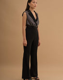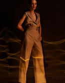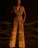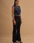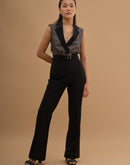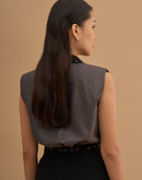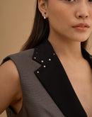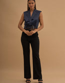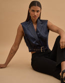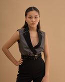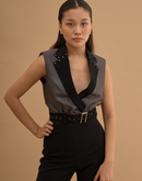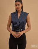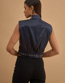 Bomber crop top with notched lapel collar decorated with rivets. Gathers in front and back. Finished with wide buckle waist band