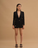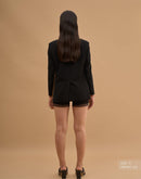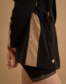 Mid waist shorts with side pockets. Finished hem with delicate lace trim and metal buttons.