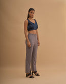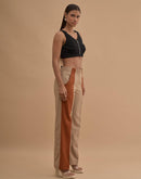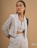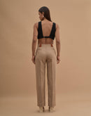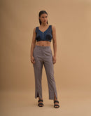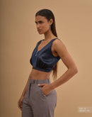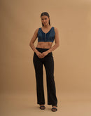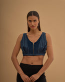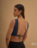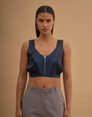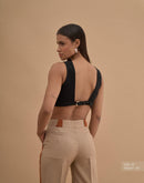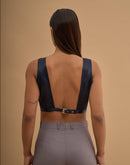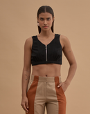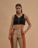 Front show zipper bralette with metal buckle closure at the back and gathers in the front.
