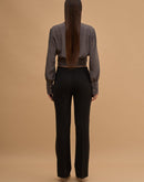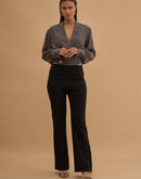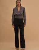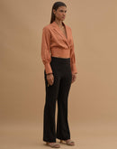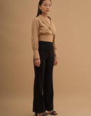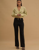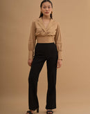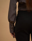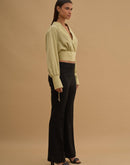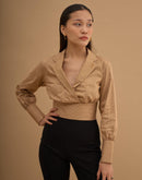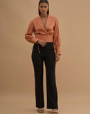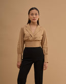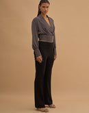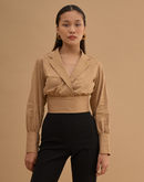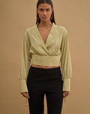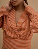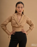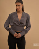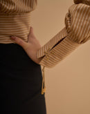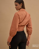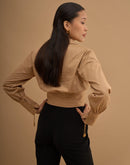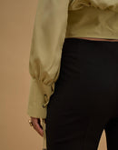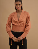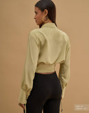 Waist sash shirt with notched lapel. Sleeves finished with wide cuff and metal eyelets and metal rope ends. Concealed zip closure on the side.