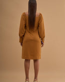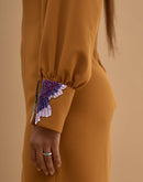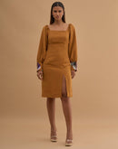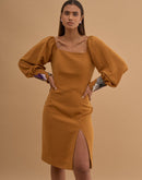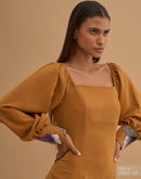 Hand embroidered Straight fit dress with front slit. Square neck, lantern sleeves finished with wide cuff, embroidery and concealed button closure on cuff.