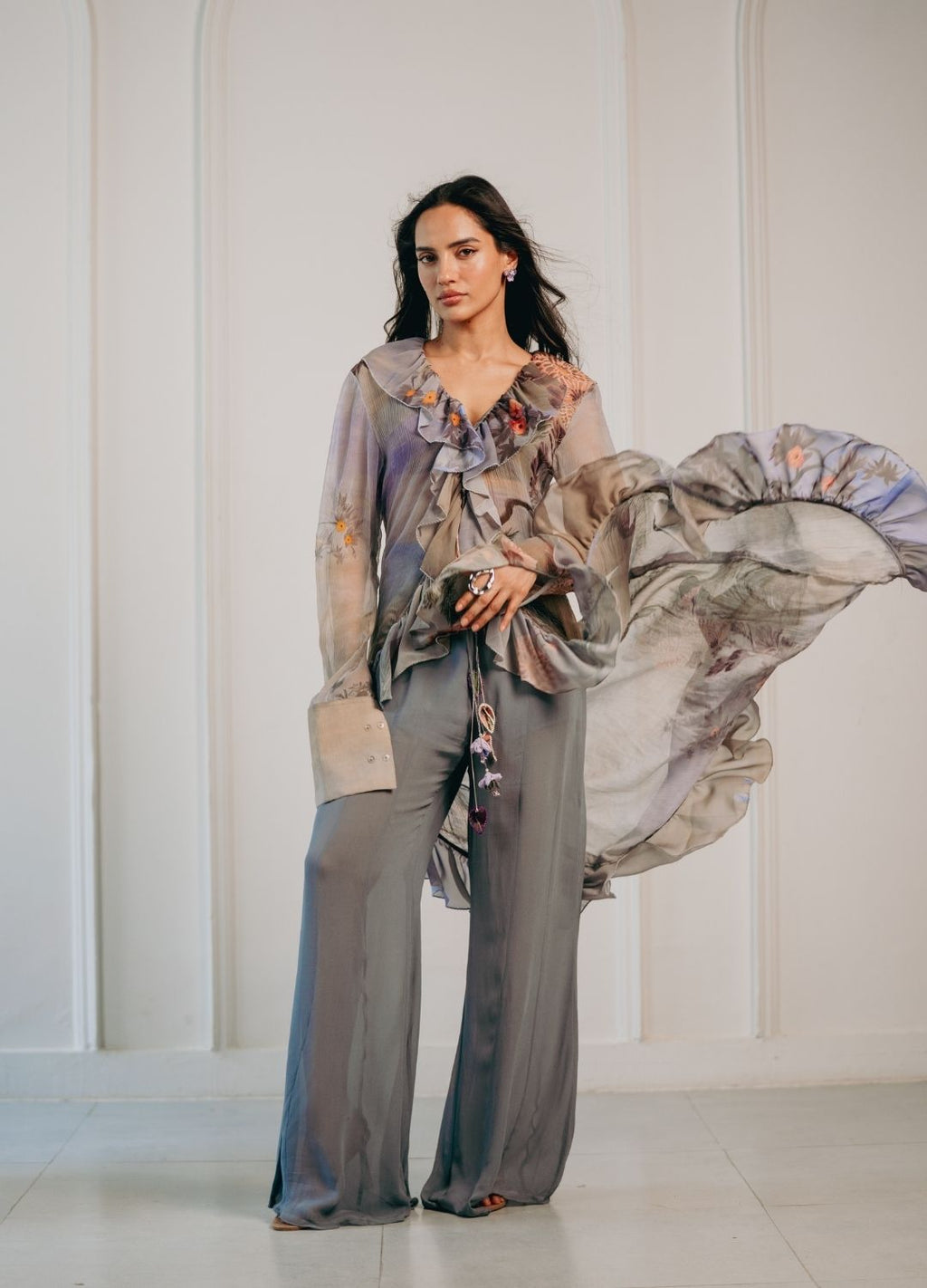 Crafted from featherlight chiffon, the blouse flows with soft ruffles cascading from the neckline into a dramatic high-low train. The print unfolds in muted lilacs, dusk greys, and earthy tones — like a garden fading into eveni...