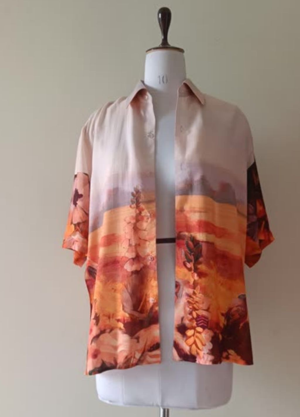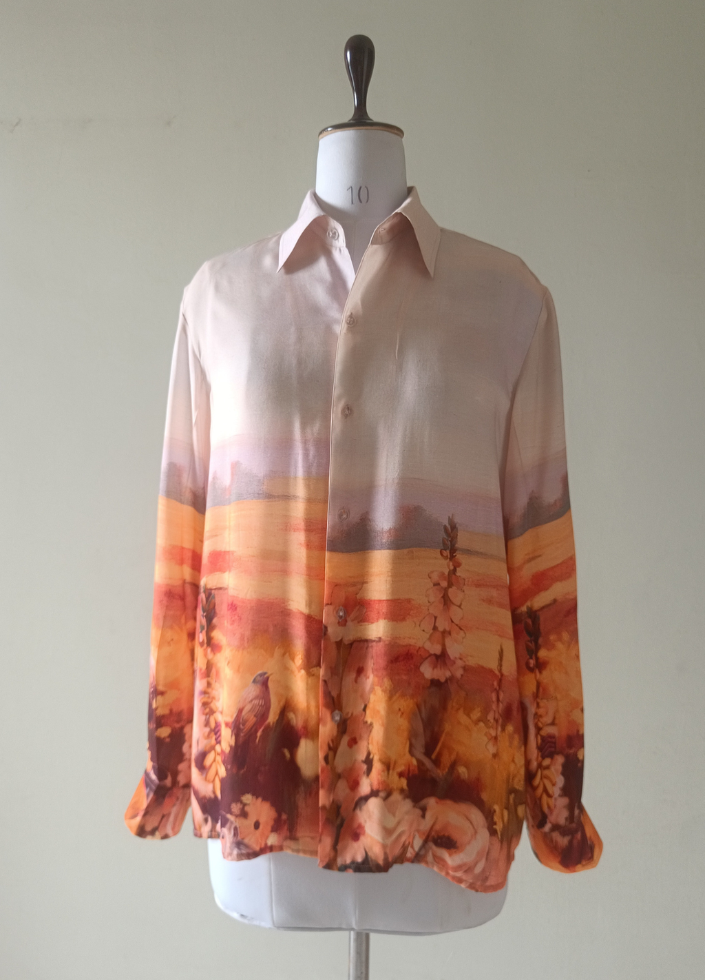 A breezy statement shirt in ultra-soft, featherlight fabric — this piece blends delicate tailoring with an ombré desertscape print. The warm gradient flows into painterly birds and florals, echoing a soft evening lullaby