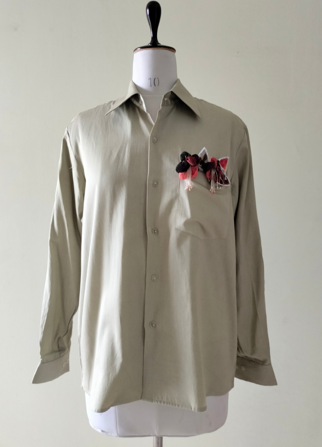 A minimal button-down in the softest sage— elevated with a quiet twist. Tailored in airy, summer-weight cotton, this shirt features asymmetric pleat detailing and a delicate, hand-cut floral cluster blooming from the chest — de...