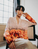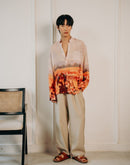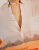 A breezy statement shirt in ultra-soft, featherlight fabric — this piece blends delicate tailoring with an ombré desertscape print. The warm gradient flows into painterly birds and florals, echoing a soft evening lullaby. Features a clean collarless neckline, fluid drape, and a front pocket stitch detail.
