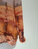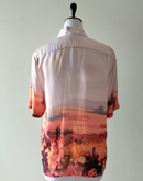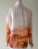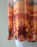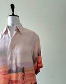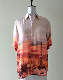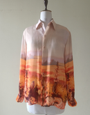 A breezy statement shirt in ultra-soft, featherlight fabric — this piece blends delicate tailoring with an ombré desertscape print. The warm gradient flows into painterly birds and florals, echoing a soft evening lullaby