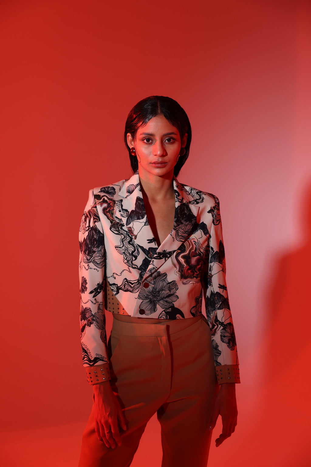 Hand embordered Boxy cropped blazer  with slim notched Lapel collar,  sleeves with slit in front. Concealed  button closure. Help us make our garments glide on you like a glove, CLICK HERE to get your permit custom made