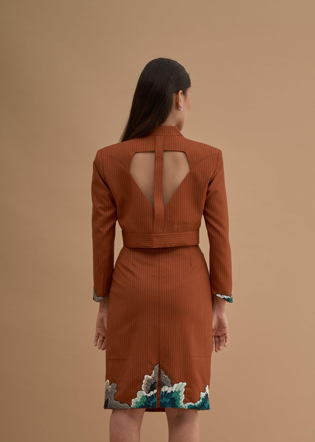 The Granite Co-ord features a stylish snatched-waist blazer with a V neckline and long sleeves, adorned with striking metal elements on the sleeves. Paired with a high-waisted pencil skirt, this set is crafted from a te...
