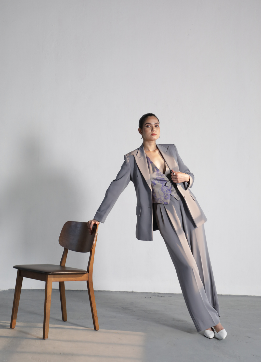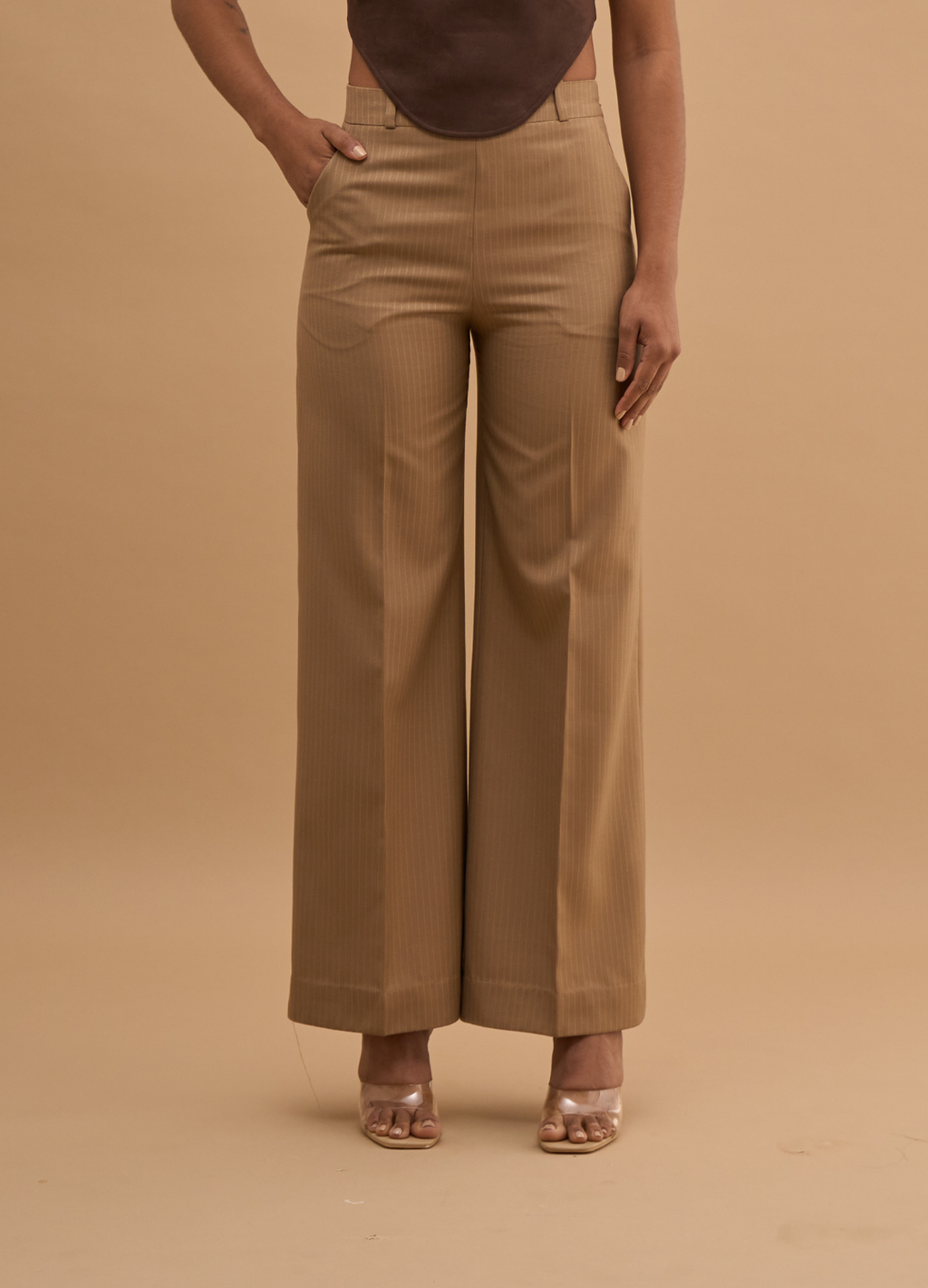 High- waisted wide leg pants. Side and back functional pockets with a concealed zip closure.