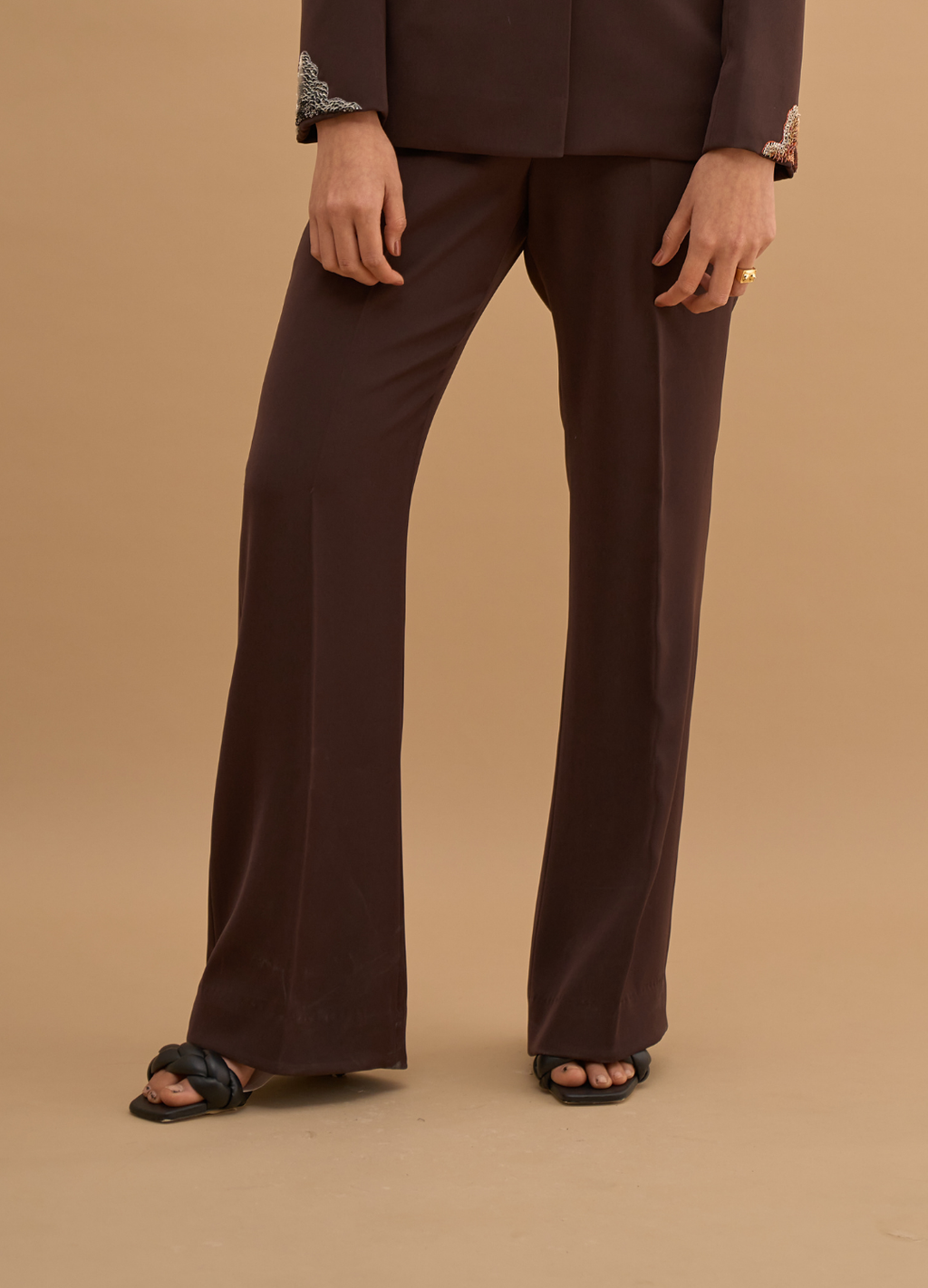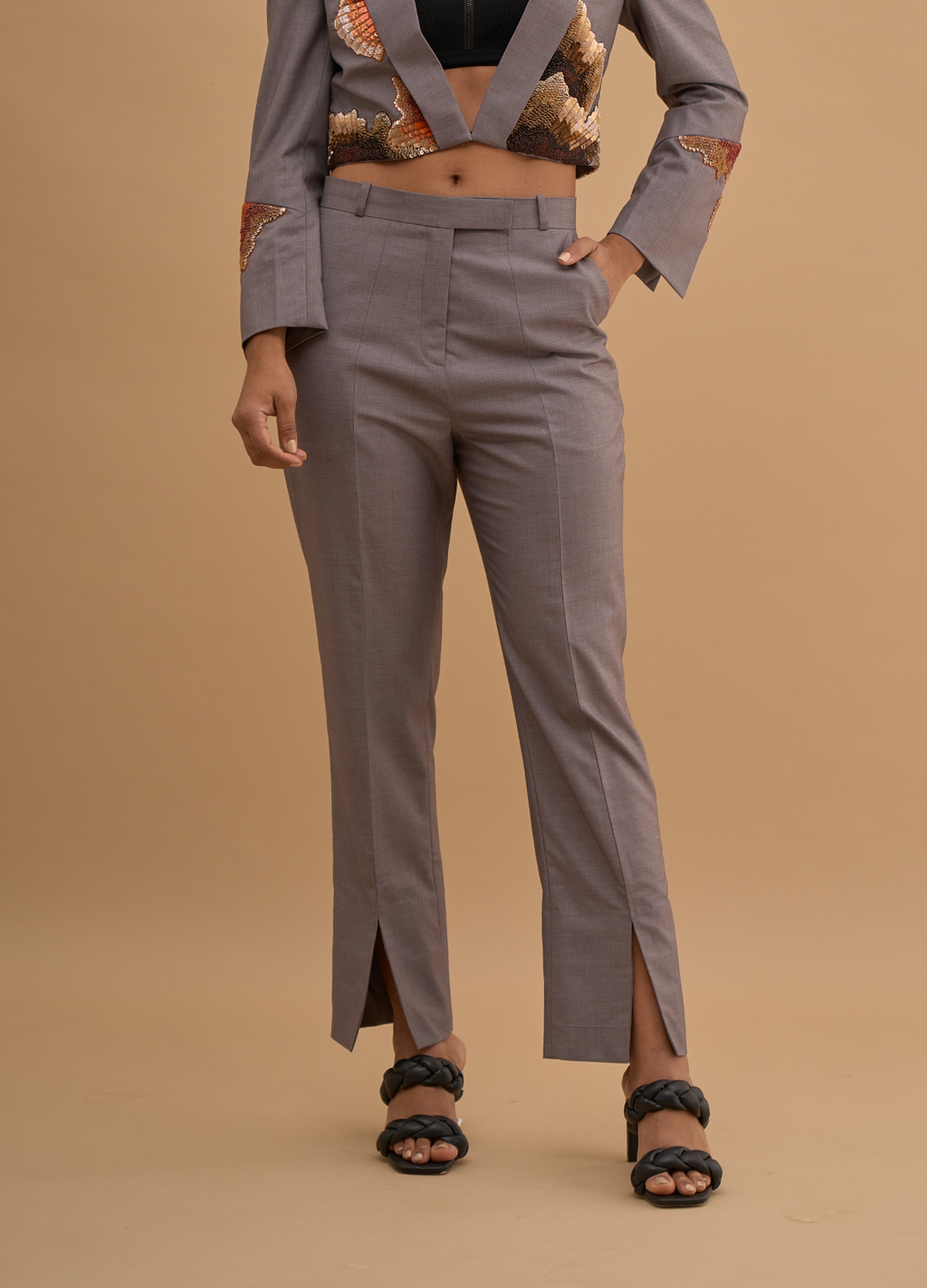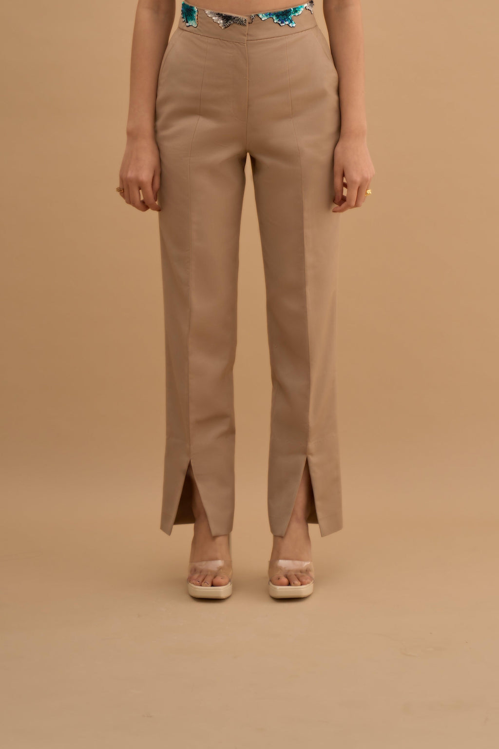Pencil/ cigarette pants with hand embroidered belt. Front slits at bottom. Help us make our garments glide on you like a glove, CLICK HERE to get your permit custom made